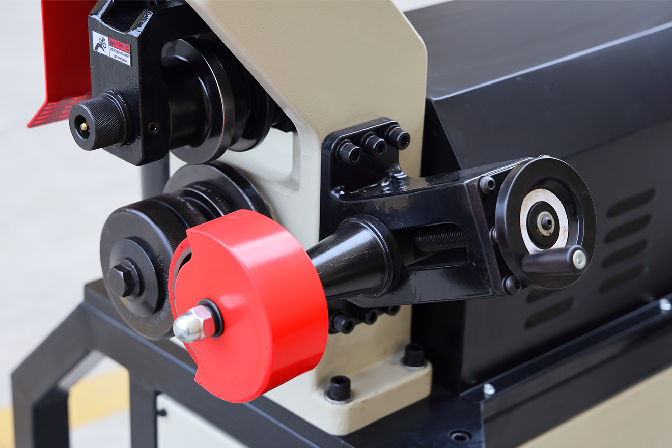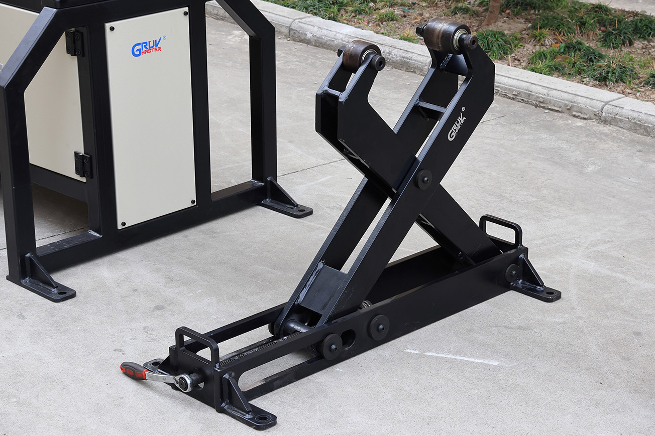 The original support legs are replaced by a reinforced frame-style base with an integrated storage cabinet, improving overall stability and easier tool and accessory storage. The roll grooving assembly has been enlarged for higher durability and more controlled groove forming, while the pipe stand is strengthened to handle heavy steel pipes. Upgraded positioning rollers further help prevent pipe drifting during grooving.