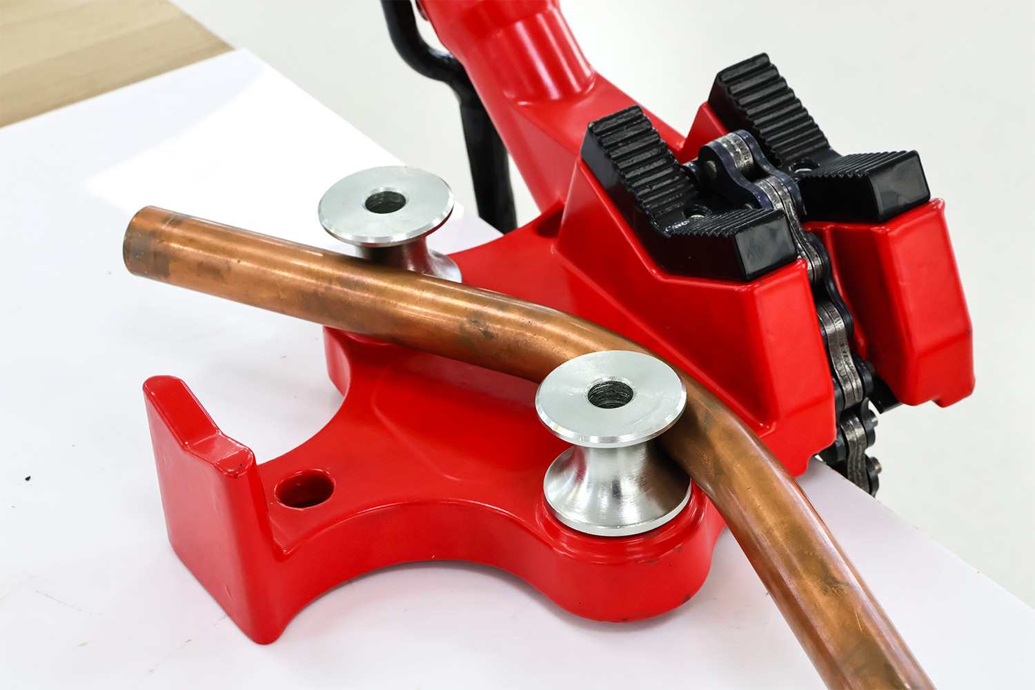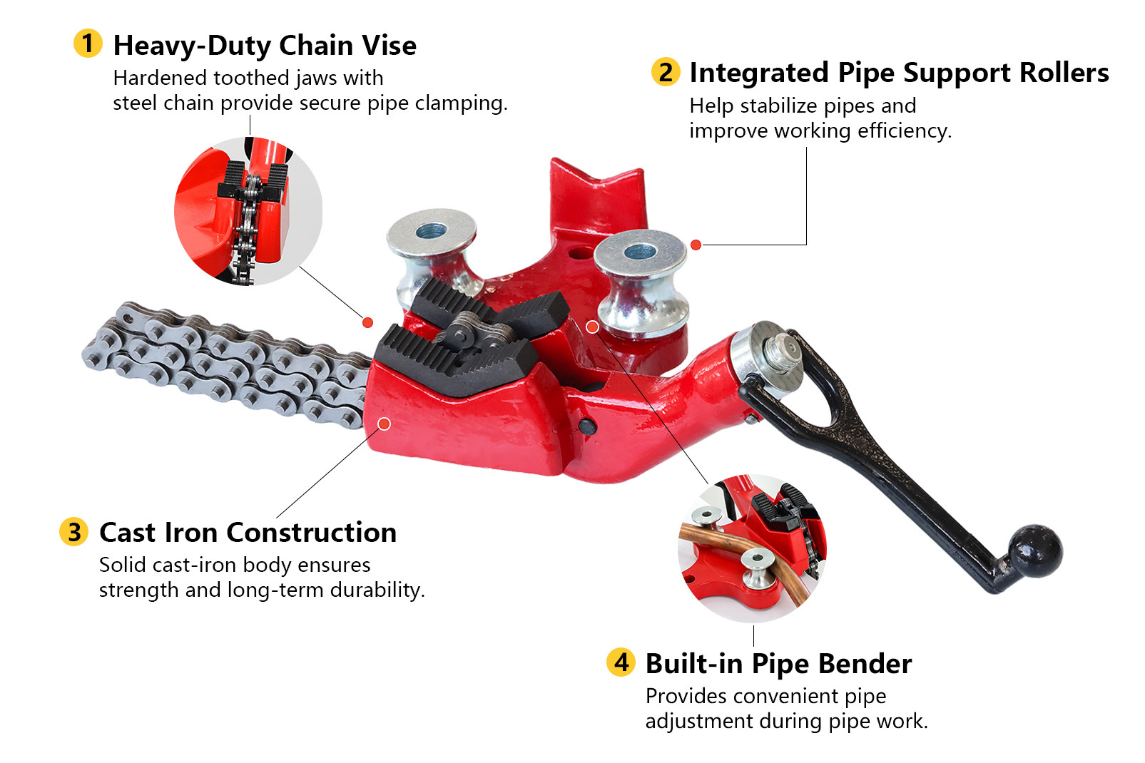 Equipped with hardened toothed jaws and a strong steel chain, the vise ensures reliable pipe clamping and secure operation. The integrated pipe support rollers and built-in pipe bender provide additional convenience during pipe handling and adjustment.