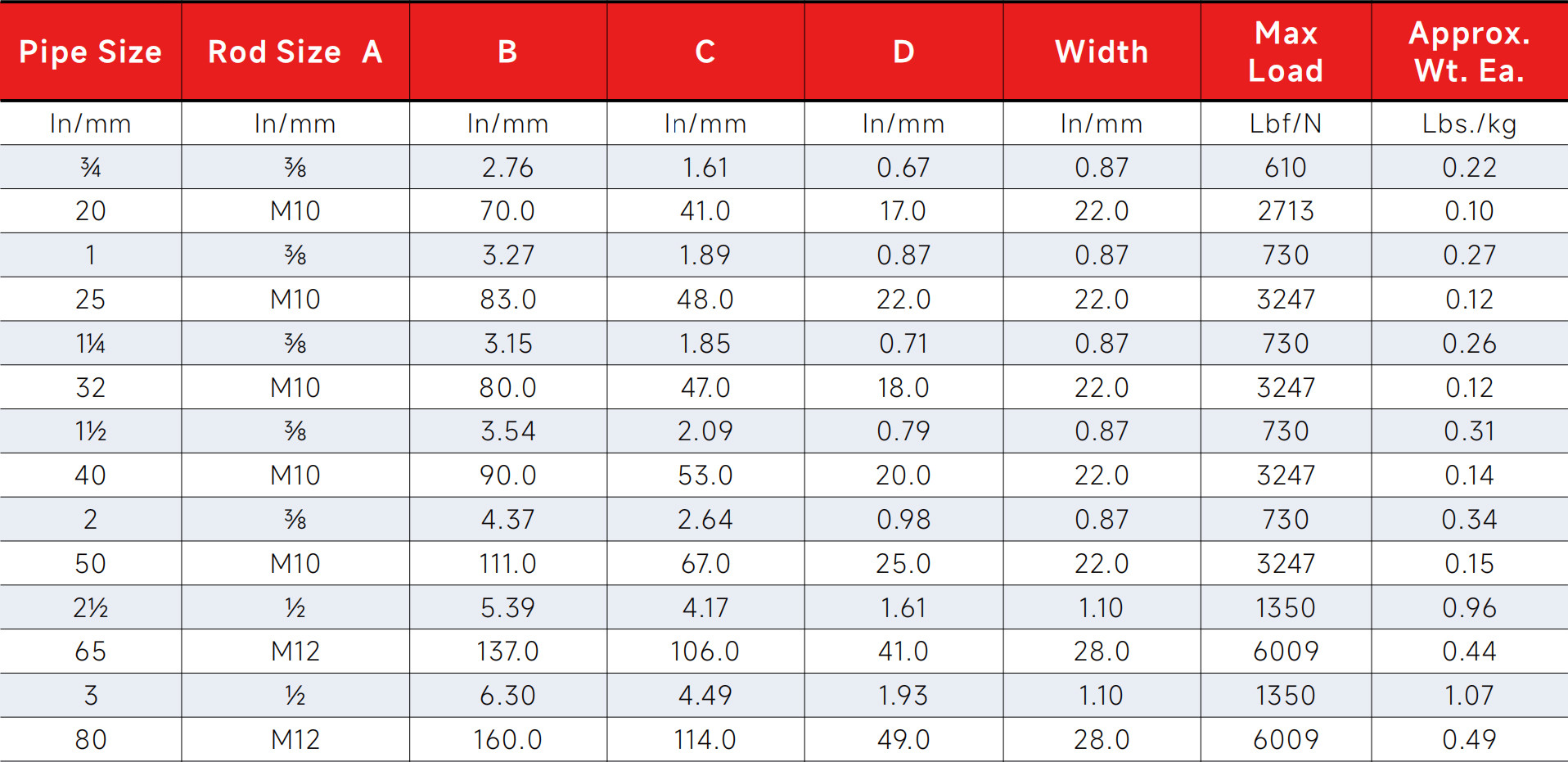 Dimensions and load capacity vary by pipe size. Refer to the table below for detailed specifications.